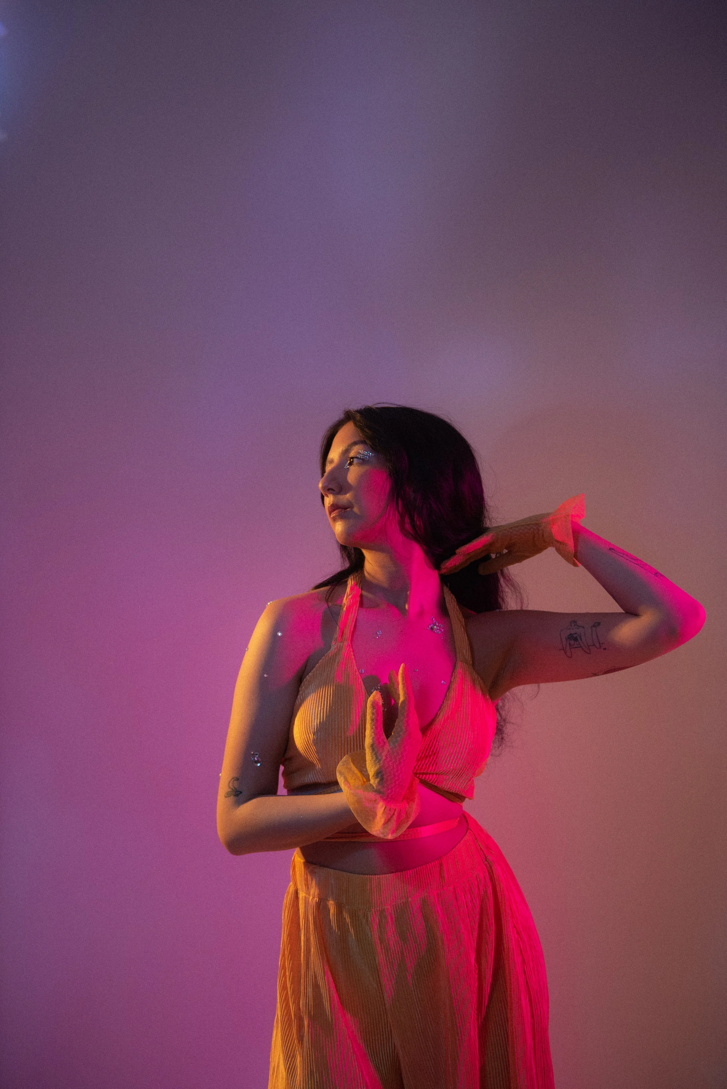 The video ended up being set to “Complicated” by Chris Oday, and the slow, sexy rhythmic track was perfect for the mood we were trying to achieve. We lit the cyclorama using Arri fresnels with coloured gels to create the coloured gradient, flagging off certain parts of the wall to control spill. A small LED COB light with a spotlight attachment and gel was used as our key, and an Aputure 300D with a large softbox and grid acted as a fill. We shot on a Sony A7Siii with Sony primes, adding a 1/4 black pro mist and star eight filter to get that ethereal glowy effect and crosshatching on the rhinestones when they caught the light of our key.